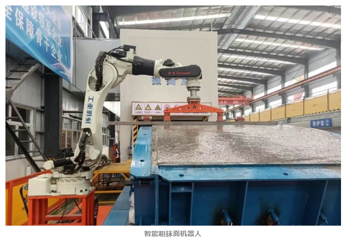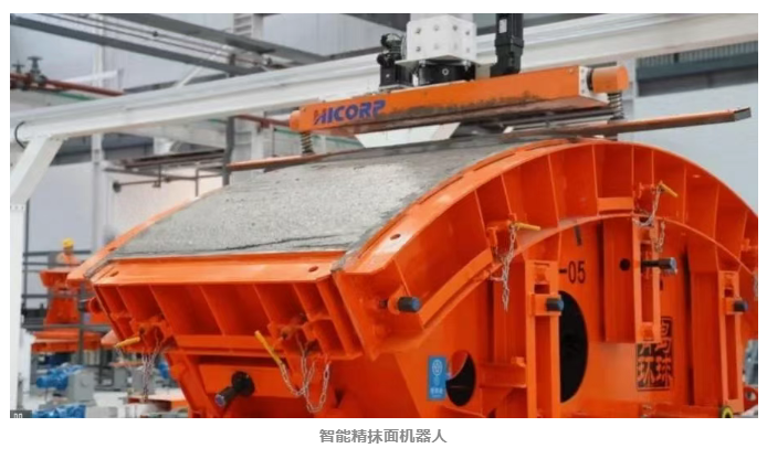 智能粗抹面機(jī)器人:智能粗抹面機(jī)器人根據(jù)人體仿生學(xué),模擬人工操作流程,實現(xiàn)盾構(gòu)管片的智能粗抹面;刀體和混凝土接觸面的角度適時變換,以達(dá)到最優(yōu)的接觸角度,收到最佳的抹面效果。實現(xiàn)了管片生產(chǎn)過程抹面與收面操作的無人化智能操作。